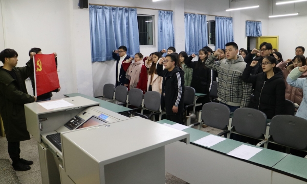 会前,全体党员满怀激情齐唱国际歌。会中,首先由宋卿老师宣布新党员名单,周凡力老师为新党员颁发入党通知书。随后,贺方云老师带领全体新党员在党旗下庄严宣誓。宣誓仪式中大家神情庄重,眼神坚定,满怀着对党的敬畏。接着,新党员代表张敏同学发言,表达自己激动的心情及如何恪守在党旗下的诺言。
