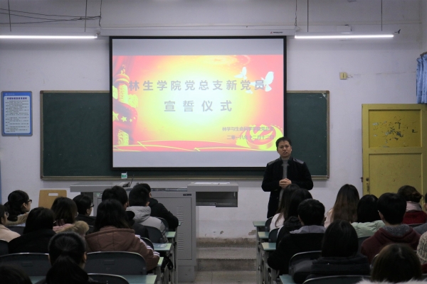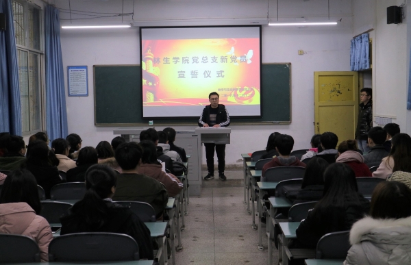 2018年12月12日,林学与生命科学学院党总支在1106教室召开新党员宣誓仪式。出席本次会议的有党总支书记谢荣成,专职组织员、团总支书记贺方云,第一支部书记周凡力,第三支部书记宋卿、新党员及积极分子等共计50余人。本次大会由贺方云老师主持。
