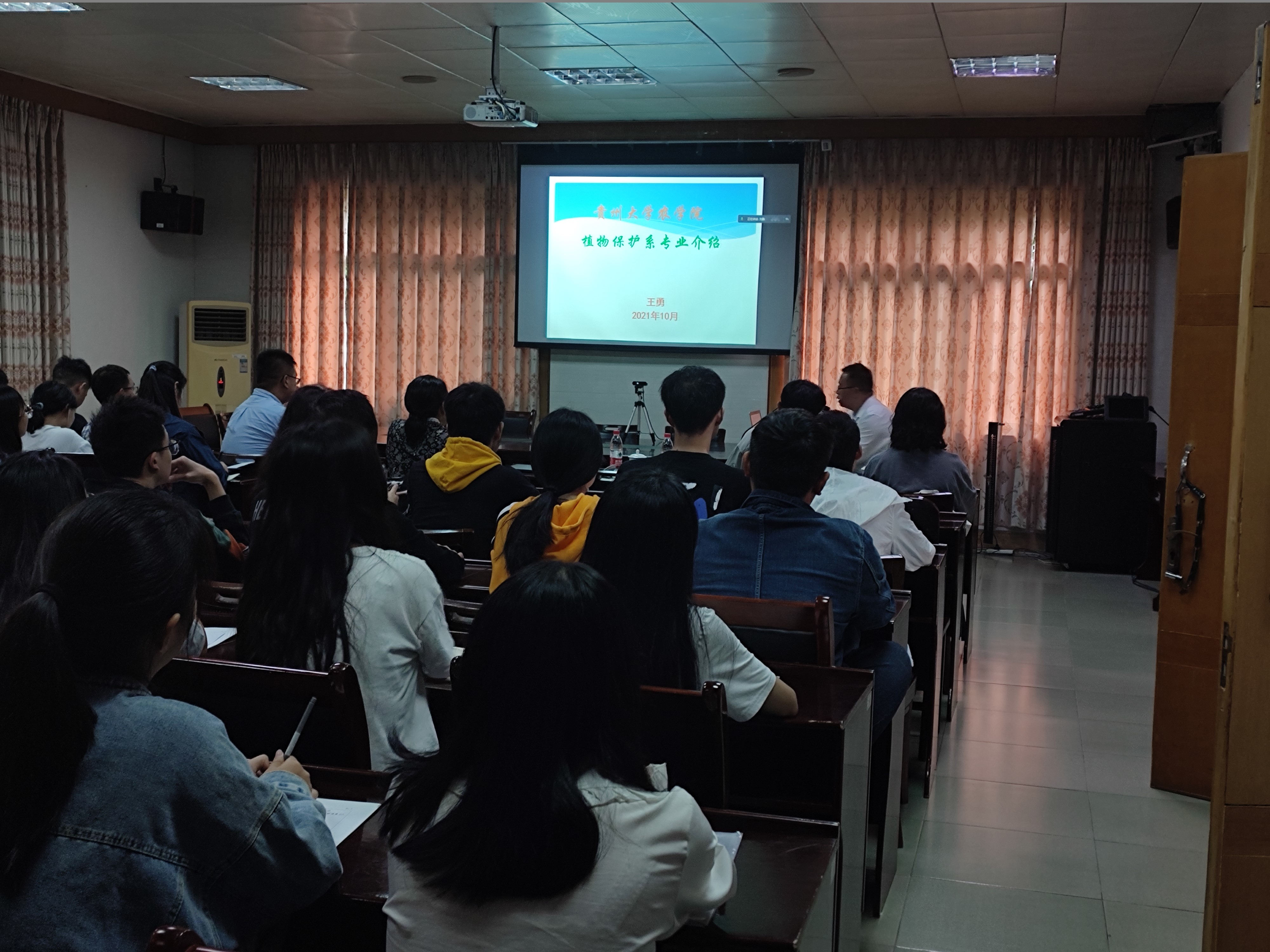 2021年10月8日下午,应学院邀请,贵州大学王勇教授与我院师生进行一场线下学术交流。王教授是贵州大学特聘教授、博导,贵州省青年科技奖获得者,中国植物病理学会理事,主要从事植物病原学及微生物资源利用研究。他为师生们分享了贵州大学农学院的概况、特色、主要研究领域和方向以及国内外合作研究状况,分享了他的一些研究成果,师生们获益良多。