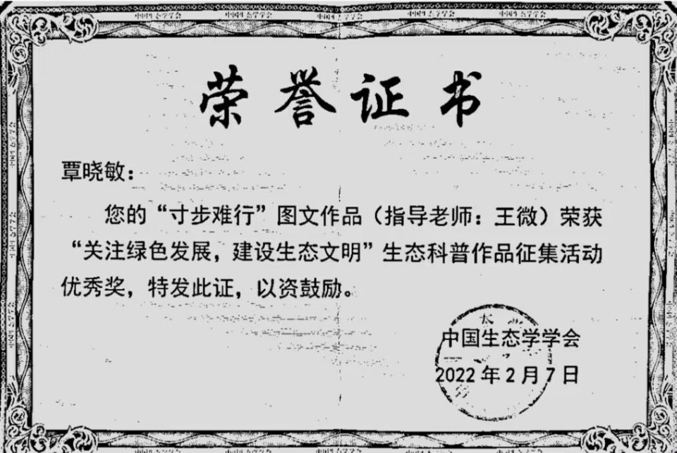 我院园林专业覃晓敏同学在王微老师指导下创作图文作品《寸步难行》,获得“关注绿色发展,建设生态文明”生态科普作品征集活动优秀作品奖。该活动由中国生态学学会举办,旨在提高公众生态环境意识和科学素养水平,推进绿色发展和生态文明建设,共建青山常在、绿水长流、空气常新的美丽中国。