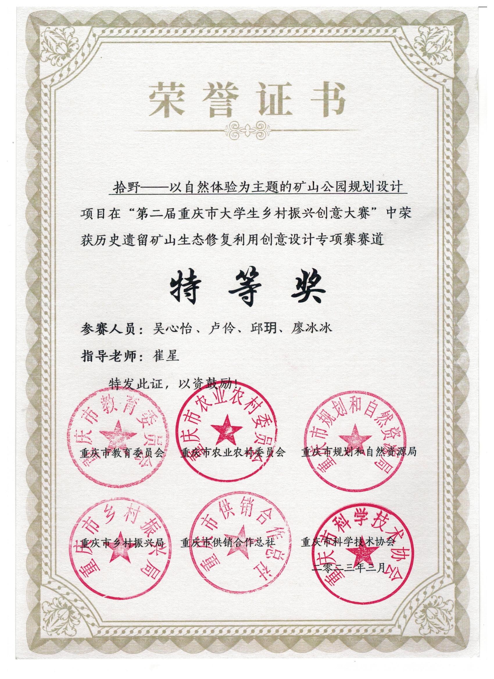 近日,由重庆市教育委员会、重庆市农业农村委员会、重庆市规划和自然资源局、重庆市乡村振兴局等部门联合主办的第二届重庆市大学生乡村振兴创意大赛获奖名单公布,园林专业学生吴心怡、聂星宇、李淼等13位同学的作品分别获得特等奖、三等奖,指导教师崔星获评“优秀指导教师”。