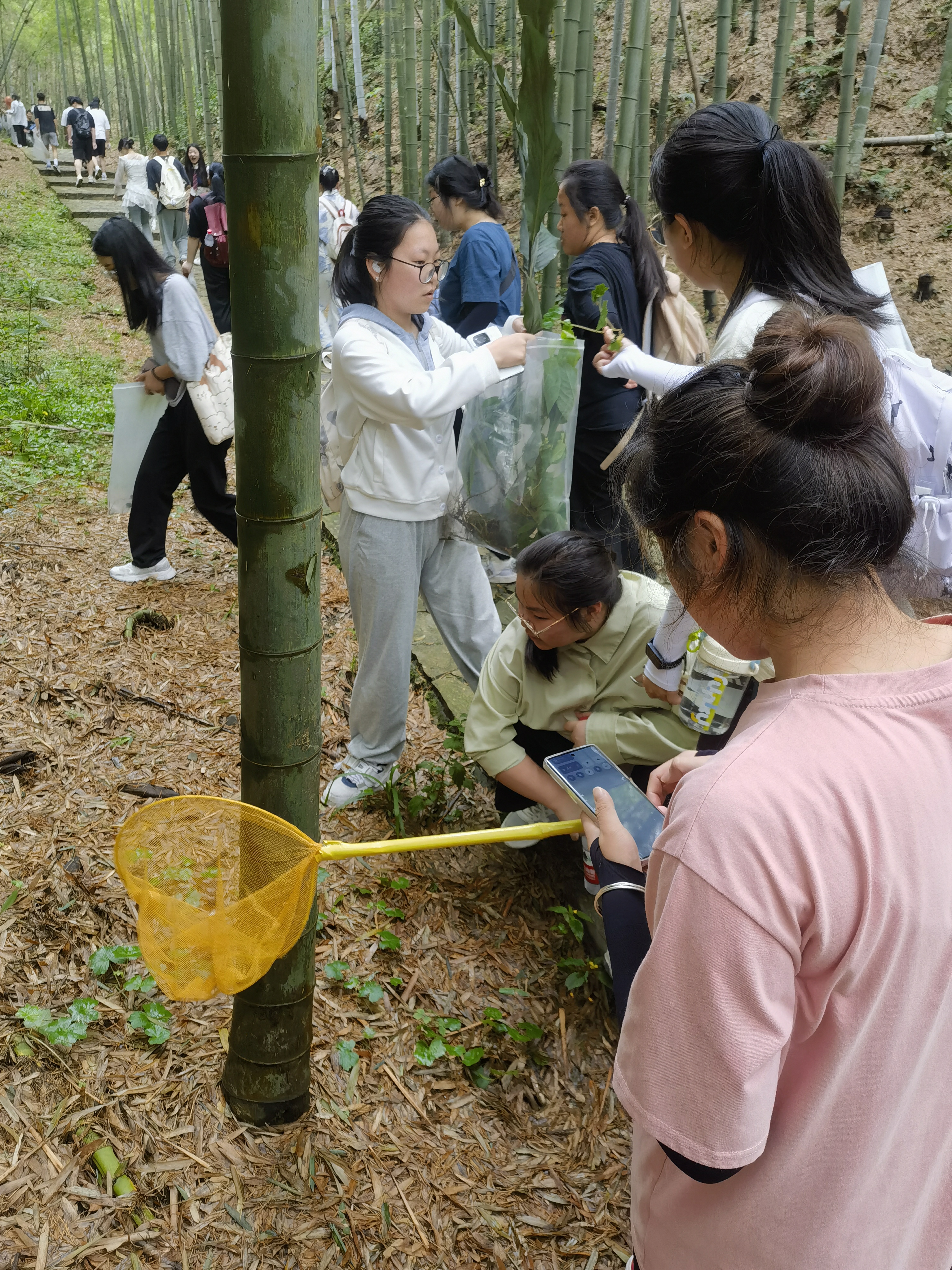 5月25至26日,2023级生物技术专业共57名同学在指导教师夏茂芹和吴泳江两位博士的带领下赴茶山竹海开展野外实习。夏老师给同学们介绍了各种野生植物及习性,现场讲授如何对植物进行识别和分类。两位老师带领同学们带上枝剪和捕虫网等工具沿路观察和采集动植物标本,制作的植物标本有异叶榕、木蓝、落地梅、过路黄等,动物标本包括石龙子,菜粉蝶,蜻蜓等。