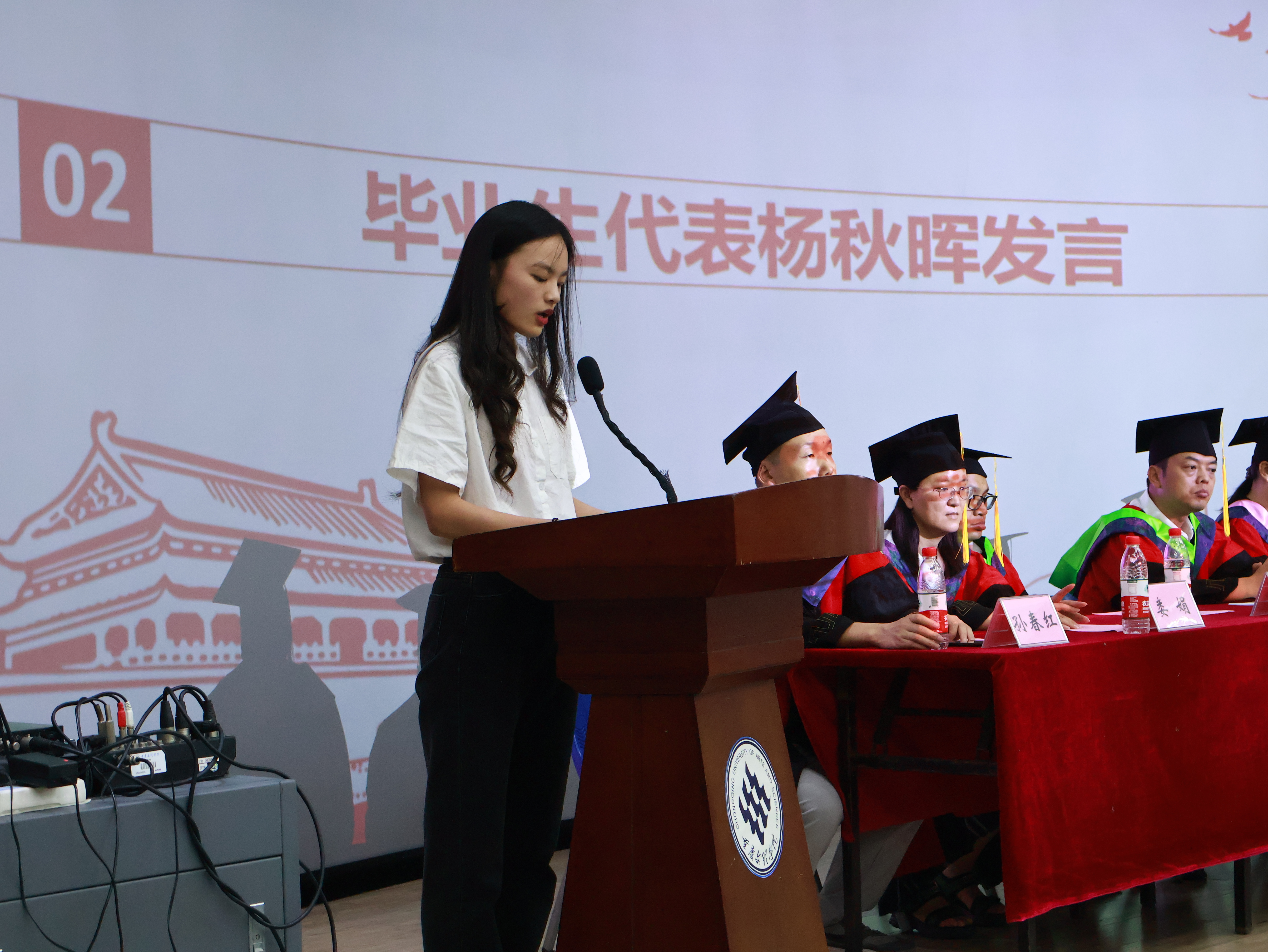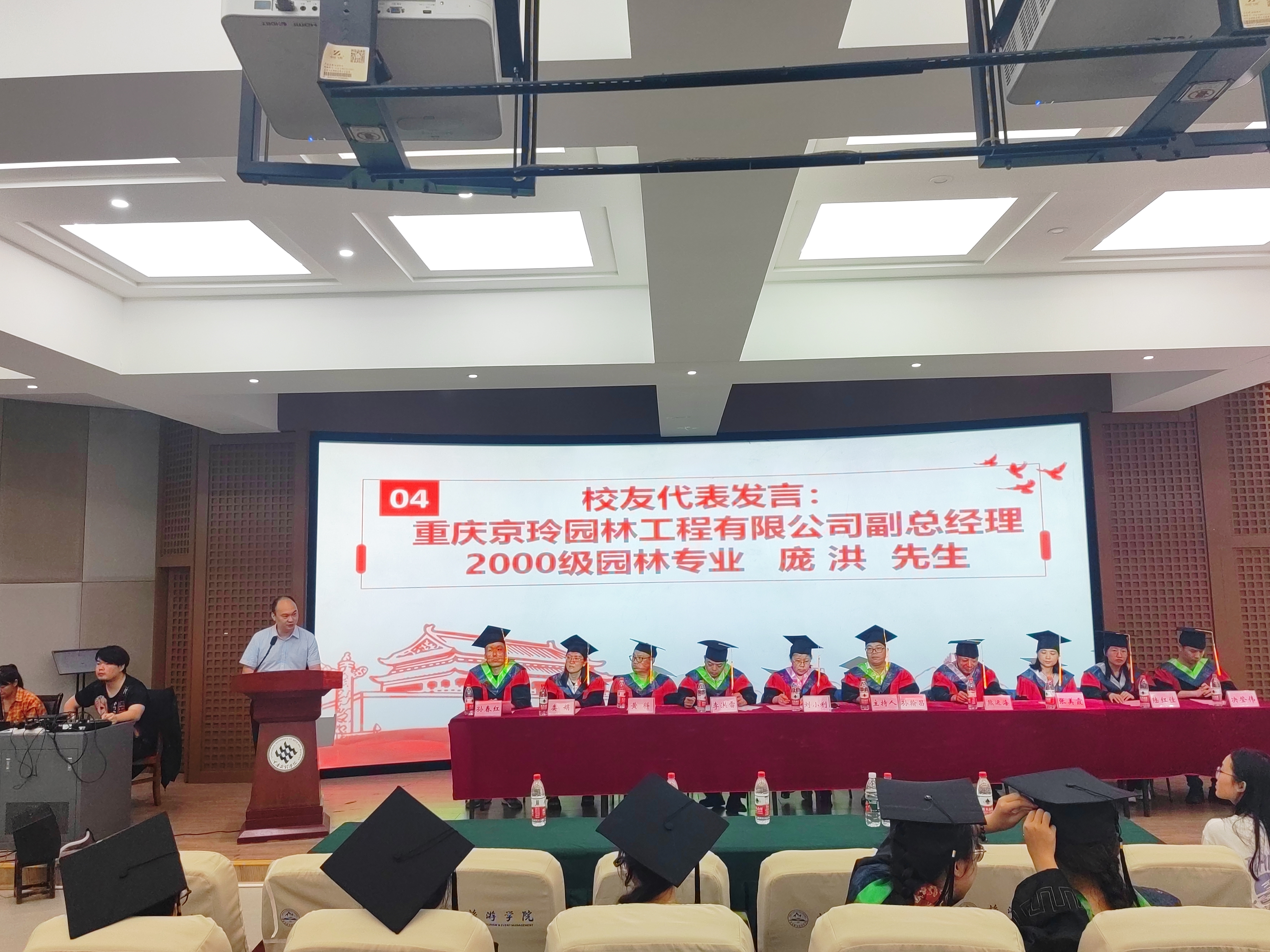毕业典礼在雄壮的国歌声中拉开序幕。毕业生代表杨秋晖、陈尧分别发言,回顾大学以来在母校的成长,表达了对母校,学院领导,老师和同窗们的感激不舍之情。重庆京玲园林工程有限公司副总经理、2000级园林专业校友庞洪作为校友代表发言。深情寄语学弟学妹,一要充分相信自己,自己是最棒的。二要完成学生到社会的转变,三要充满学习态度去了解社会,体会人情世故。四要学会感恩,学会欣赏。