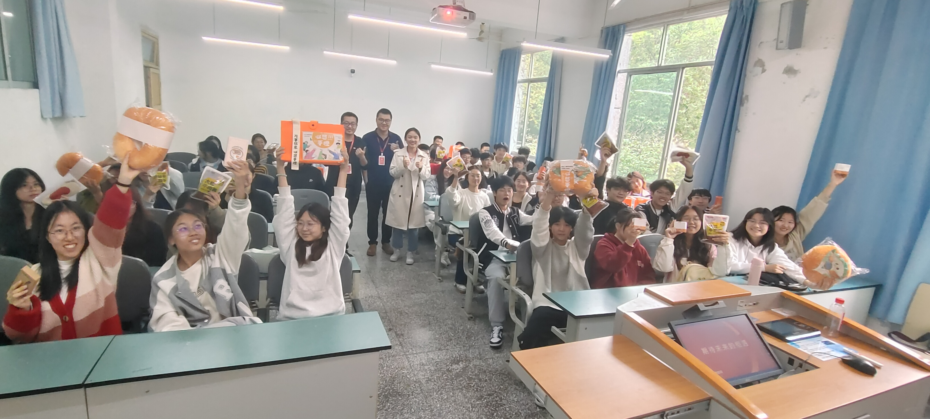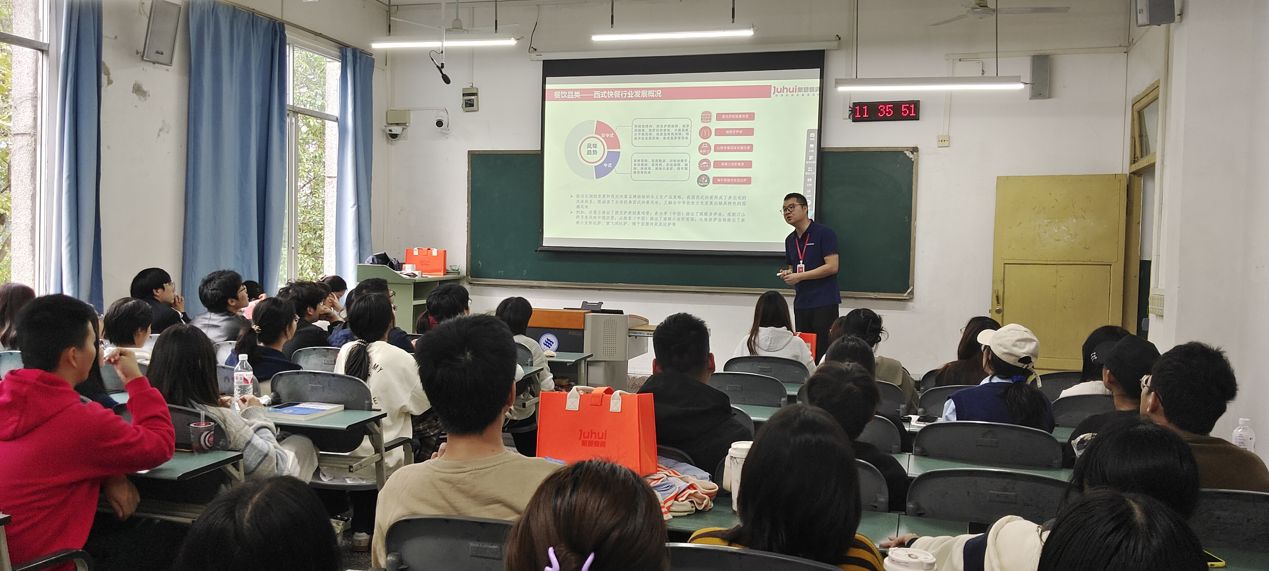 徐萌首先概述了餐饮行业的现状和发展趋势,随后从多个品类入手,深入分析了各细分行业的发展概况。在讲座进行中,他设计了互动环节,提出了一系列相关问题,同学们纷纷积极回应,踊跃参与问答,现场气氛非常活跃。公司随行人员为回答正确的学生颁发了小奖品,以示鼓励。此外,徐萌还结合自身丰富的从业经验,分享了餐饮行业在技术创新、品质控制以及市场趋势等方面的独到见解。同时他强调,在快速变化的餐饮市场中,持续学习和创新是提升竞争力的关键。