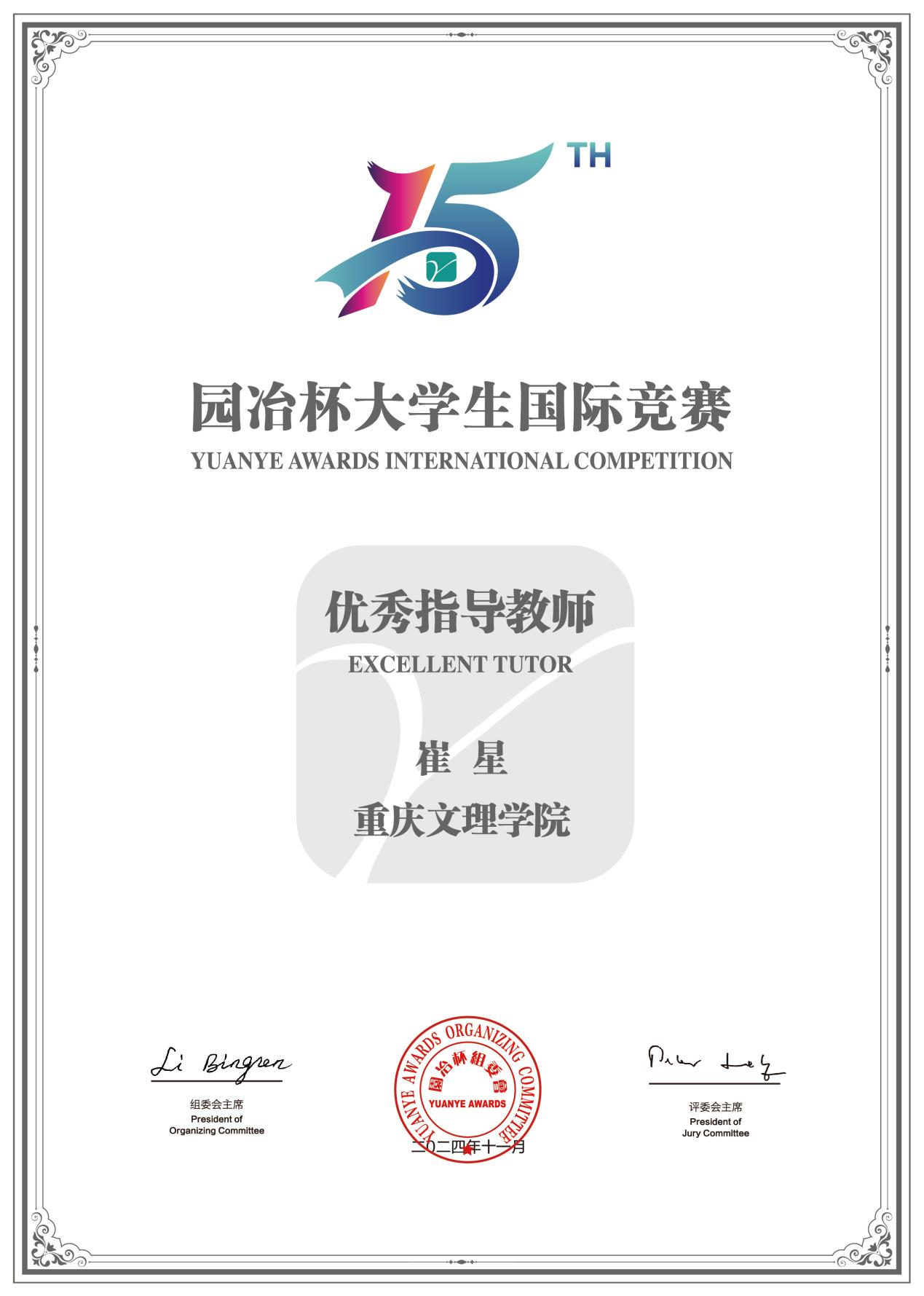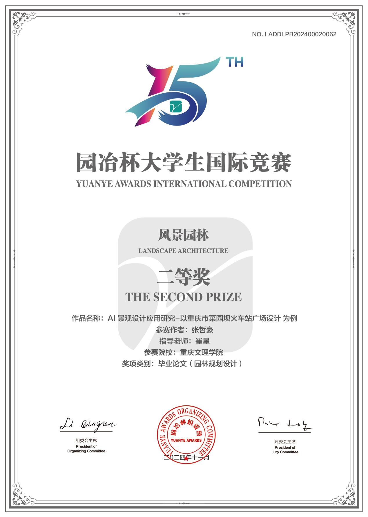 近日,在第十五届园冶杯大学生国际竞赛中我校2020级园林专业学生张哲豪毕业设计《AI景观设计应用研究-以重庆市菜园坝火车站广场设计为例》荣获二等奖,崔星被评为优秀指导教师。本次竞赛共收到作品3443件,经由园冶杯秘书处的严格审核与专家团队的初步评定后,210件作品进入复审阶段。