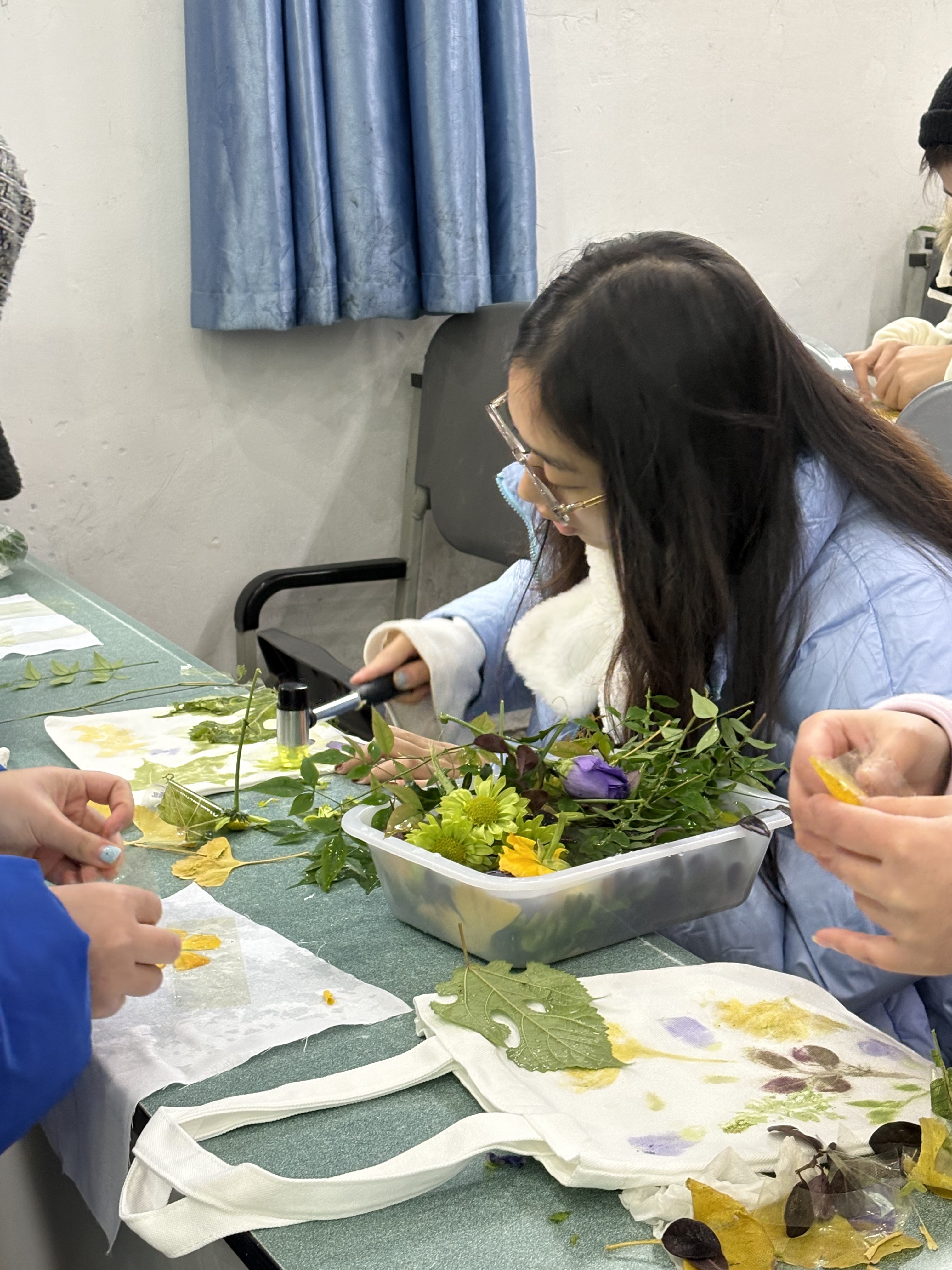 活动中,同学们满怀激情,仿佛化身为一个个探索自然的艺术家。在备齐小锤子、纱棉布以及各式各样的植物花叶等材料后,大家依照精心设计的步骤,全神贯注地投入到植物拓印作品的创作中。从细致地清洗植物,到轻巧地锤打拓印,每一个步骤都凝聚了同学们的匠心独运和无限创意。随着锤子轻轻敲打的节奏,花叶那绚烂的色彩与精致的脉络渐渐在棉布上留下了永恒的印记,仿佛将大自然的鬼斧神工与无尽美丽在此时此地凝固。