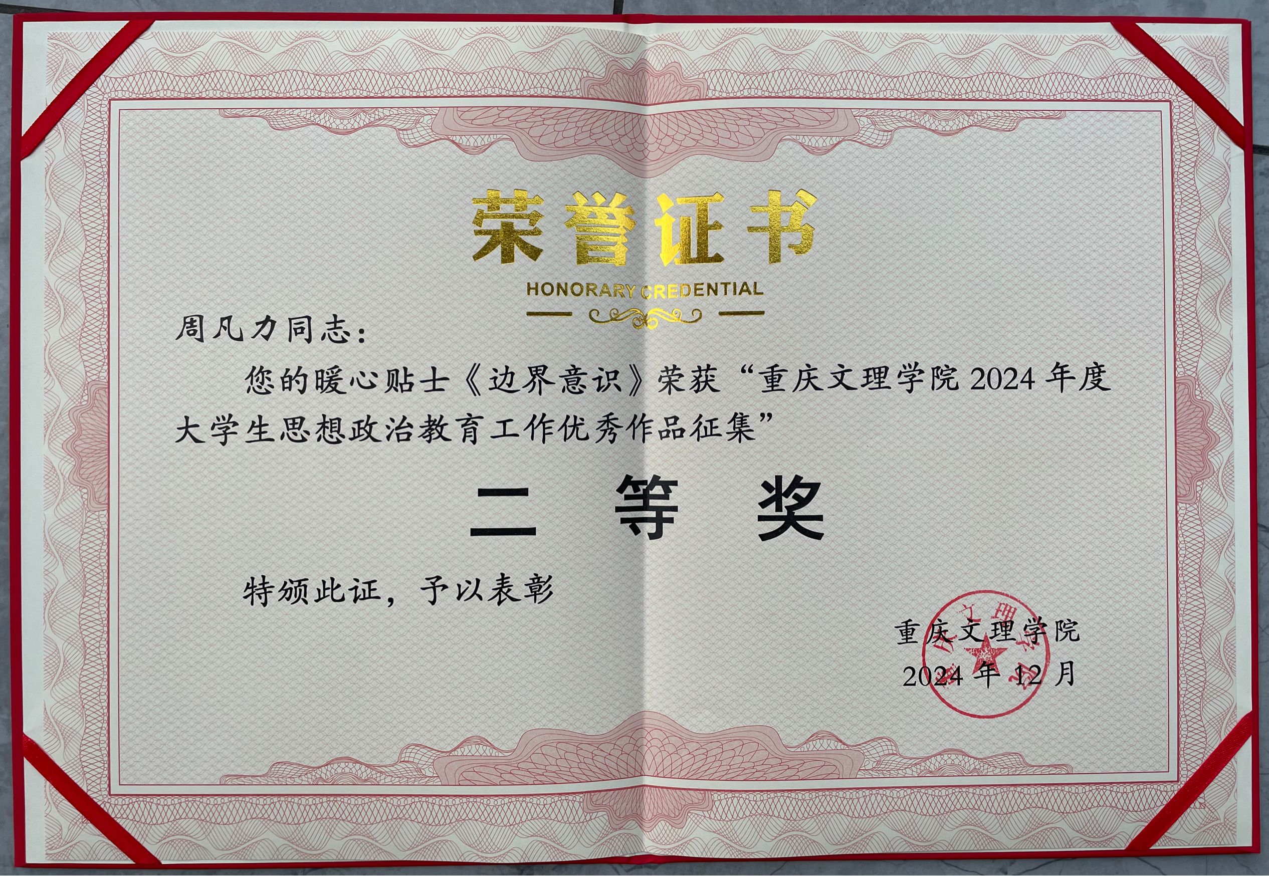 在第二届“心起点、新征程、共成长”高校心育共建优质资源征集活动中,周凡力老师的作品获暖心贴士类重庆市三等奖。