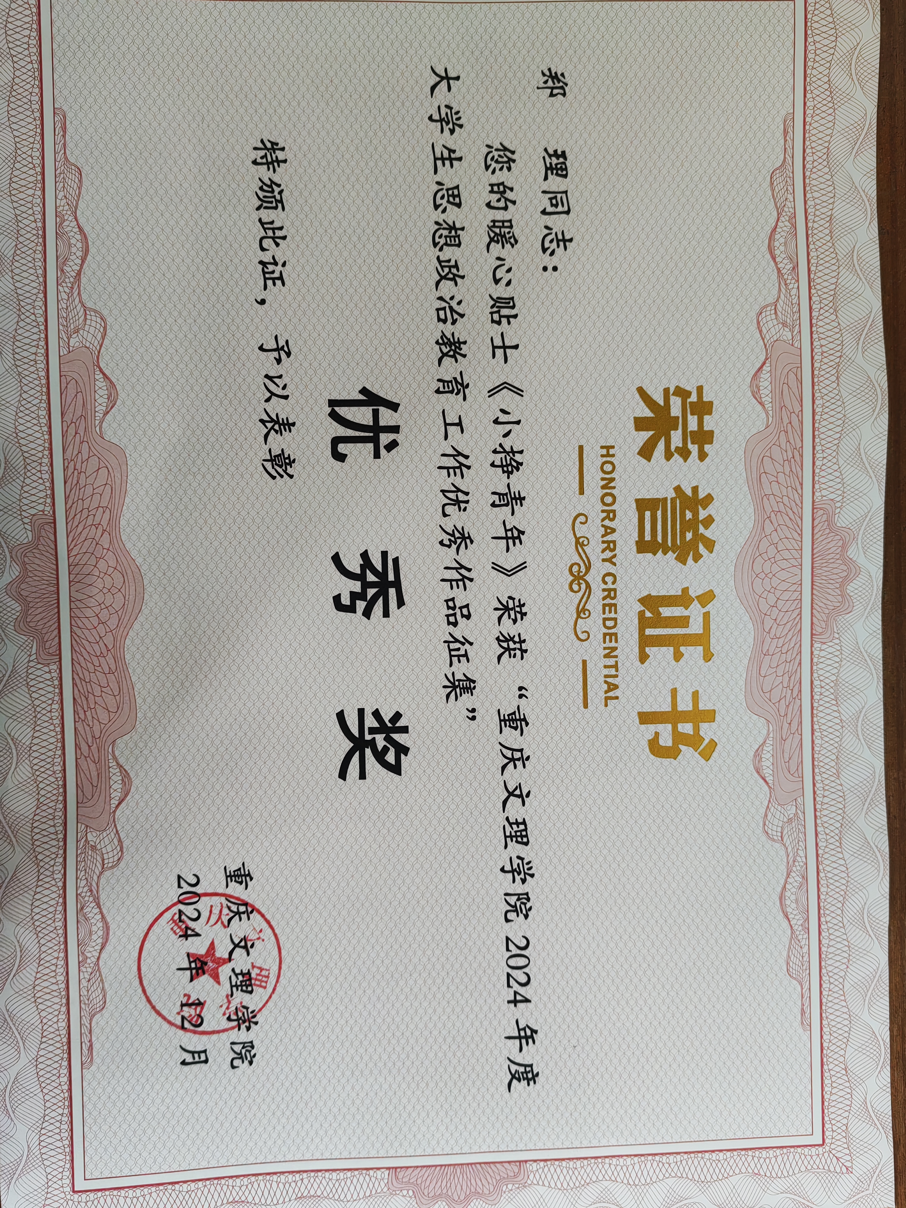 在2024年学校第六届《大学生周末思想教育》教学比赛中,郑理老师获三等奖,贺方云老师获优秀奖。在2024年学校大学生思政工作优秀作品征集中,周凡力老师暖心贴士作品获得二等奖,郑理老师暖心贴士作品获优秀奖;郑理工作案例作品获三等奖。