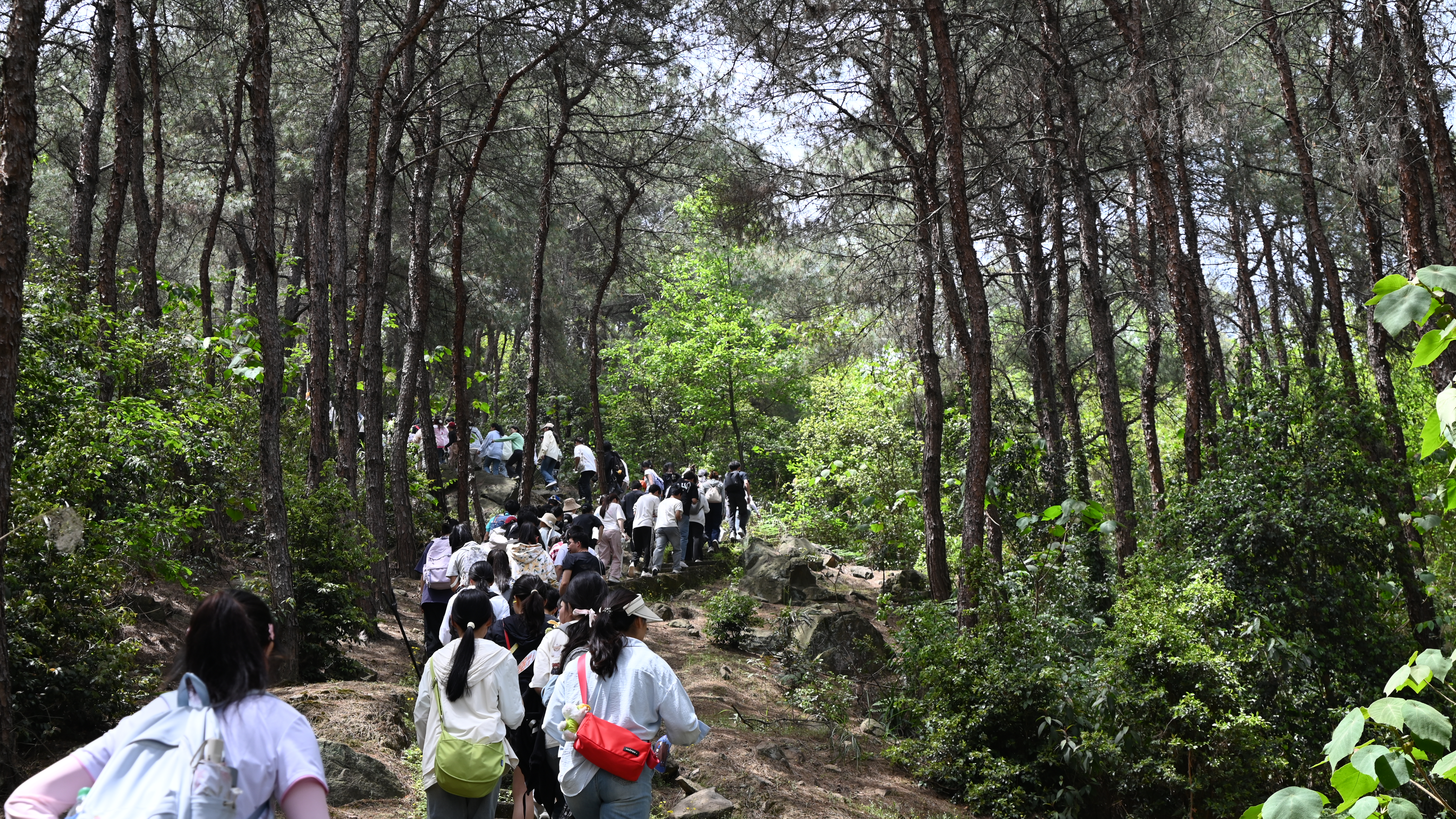 同学们手持环保袋,一边攀登锻炼体魄,一边细致捡拾沿途的塑料瓶、纸屑等废弃物。