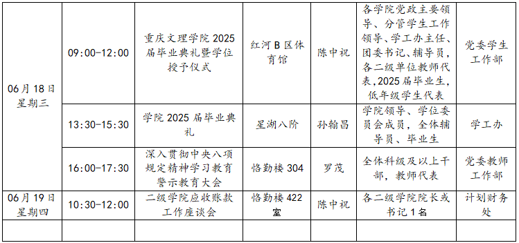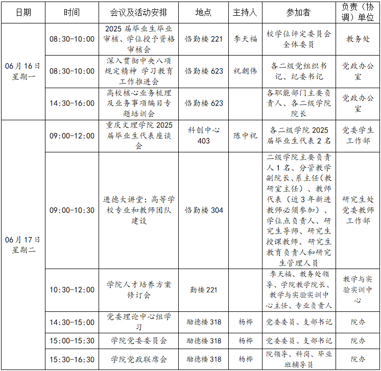 bw必威西汉姆联官网2024—2025学年第二学期第17周会议(活动)及工作安排