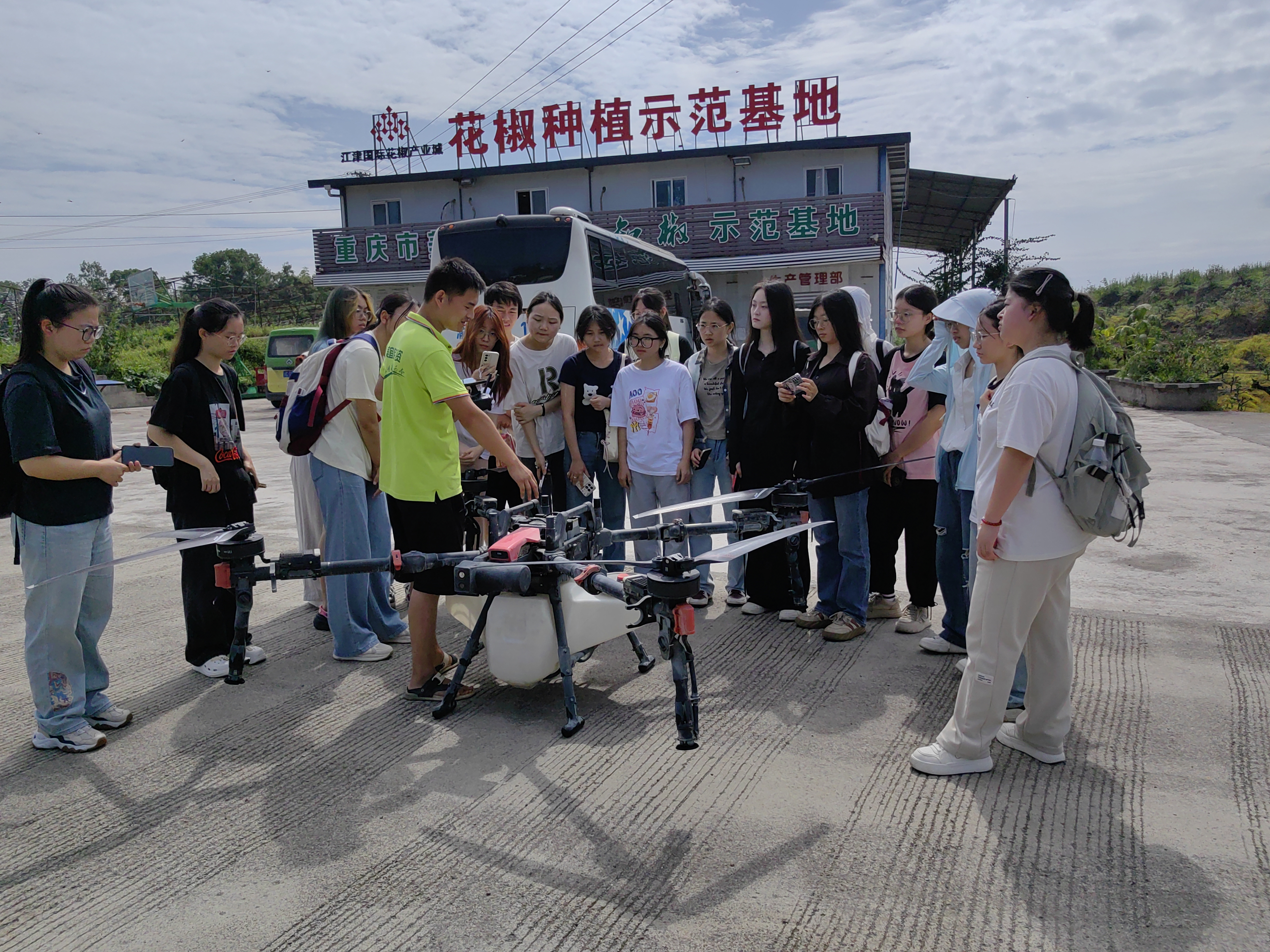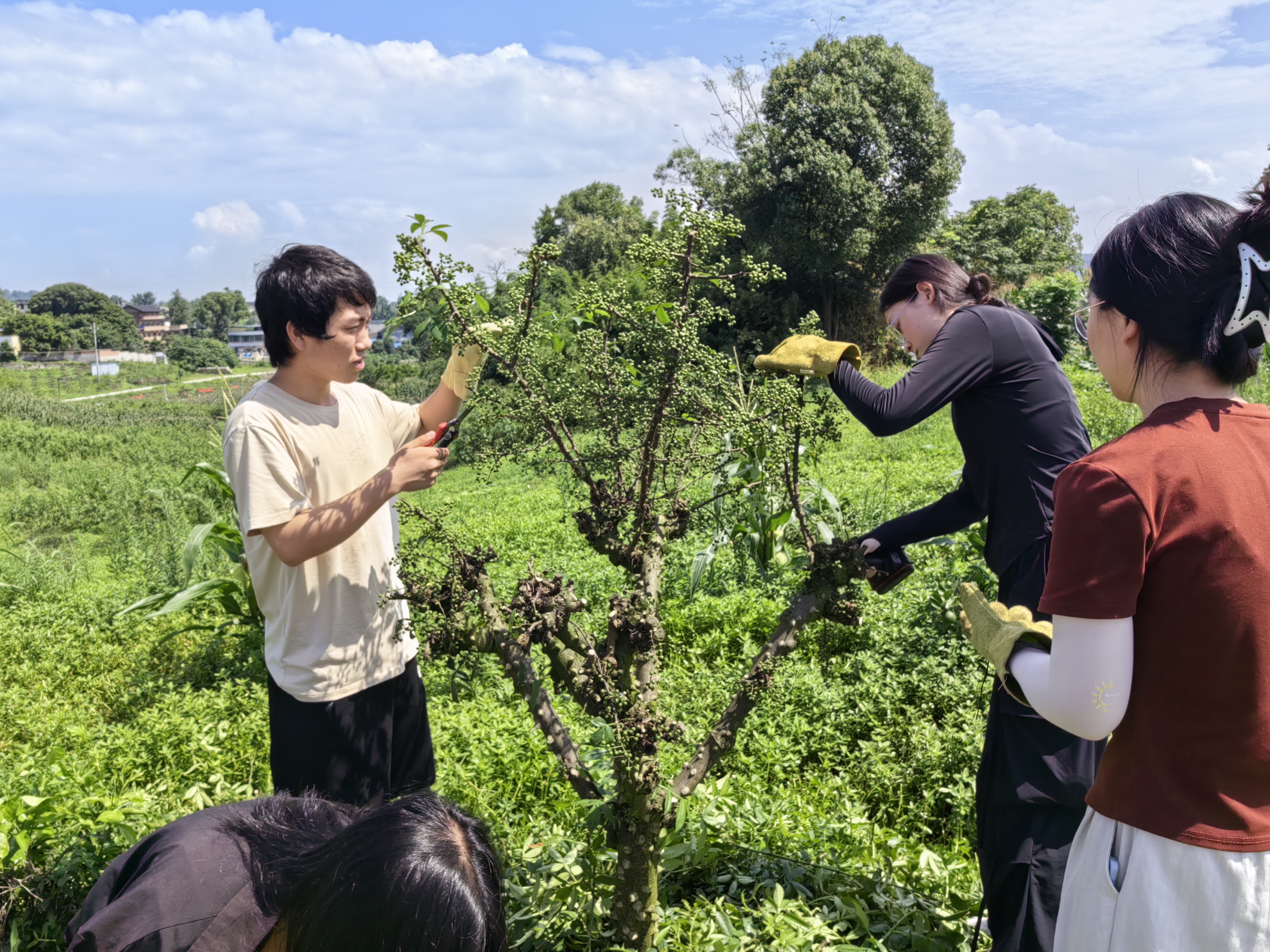 活动首日,学员们深入江津刁家天知椒花椒基地,溯源产业链前端“种植”环节,沉浸式探究花椒生态栽培的核心技术。田间地头间,大家专注研习“普剪与电剪”的实操要领,细致揣摩“净剪与毛剪”的分类规范,于实践中深刻领悟“农业技术藏在指尖”的真谛,在汗水里沉淀着对农业技术的理解。而通过实地体验无人机植保技术,更让学员们直观见证了科技为传统农业注入的革新力量,亲眼目睹现代化设备如何重塑农业生产模式。